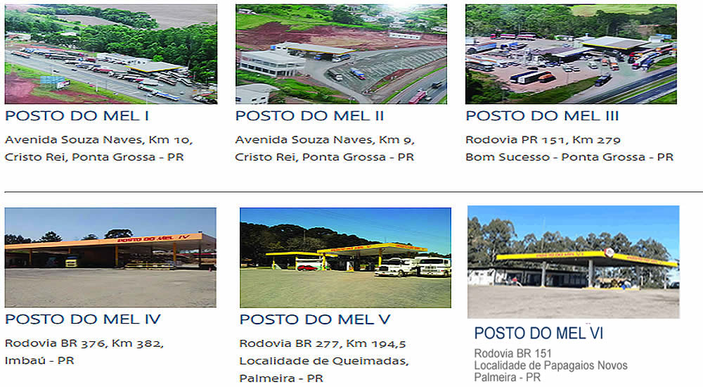 A Rede de Postos do Mel possui estabelecimentos localizados em Ponta Grossa, Castro, Palmeira e Imbaú. Em todos eles , você conta com um controle de qualidade rigoroso, amplas e modernas estruturas, excelência no atendimento, localização privilegiada, ótimos preços e condições especiais. É a excelência de 46 anos da marca Posto do Mel mais perto de você.